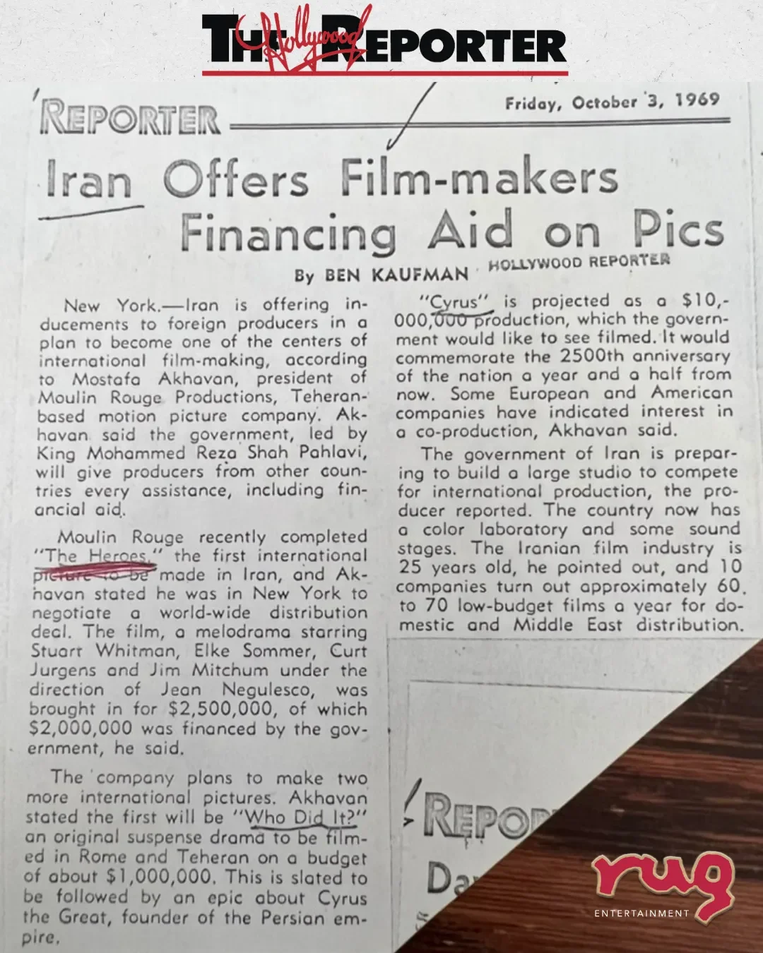 In the late 1960s, Moulin Rouge produced The Invincible Six (releaed in 1971), the first Iranian movie with an international cast and directed by Academy Award-winner Jean Negulesco. Based on the book The Heroes of Yucca, the film starred Elke Somer, Stuart Whitman, Kurt Jurgens, Jim Mitchum as well as an array of Iranian actors. The movie was filmed inside Moulin Rouge studios, and was the first US/Iran co-production shot in Iran.
